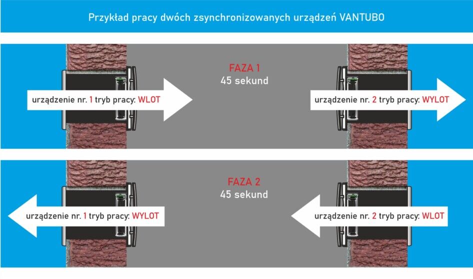 Przez kilkadziesiąt sekund przepływ powietrza następuje w jednym kierunku, następnie automatycznie kierunek się zmienia i przepływ powietrza następuje w przeciwną stronę. Dla zapewnienia nieprzerwanej wymiany powietrza zaleca się stosowanie tych urządzeń parami. Tak aby w chwili kiedy jedno urządzenie pobiera świeże powietrze z zewnątrz, drugie urządzenie wyrzucało zużyte powietrze na zewnątrz. Te urządzenia wymagają wykonania w ścianie zewnętrznej jednego otworu.