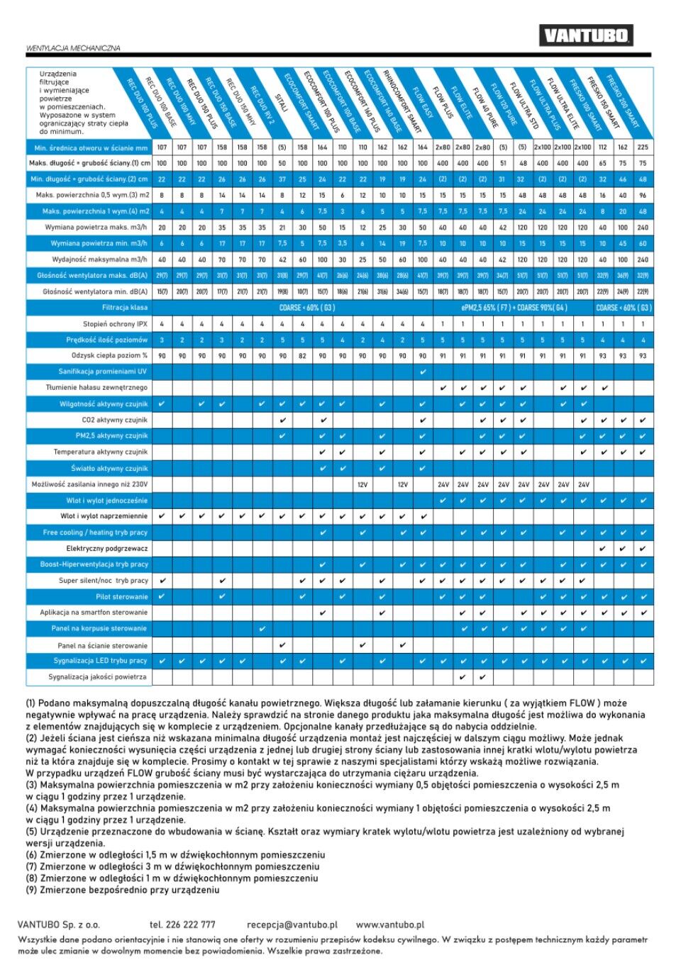 *UWAGA: Nasze wskazania dotyczące doboru odpowiedniego urządzenia do określonej powierzchni są orientacyjnie i nie stanowią części oferty handlowej w rozumieniu przepisów prawa. Obliczone zostały na podstawie danych otrzymanych od producentów i dotyczą wydajności jednego urządzenia w przypadku modeli o przepływie stałym ( FLOW i FRESKO ), natomiast dwóch urządzeń w przypadku pozostałych serii jedno-rurowych o przepływie zmiennym. Obliczeń dokonano zakładając że wymagana jest wymiana połowy objętości pomieszczenia w ciągu godziny a pomieszczenie nie jest wyższe niż 2,5 m. Lokalne przepisy mogą zalecać inne ilości wymian powietrza w ciągu jednej godziny. Prosimy zapoznać się również z informacjami na naszej stronie https://vantubo.pl/air/faq-wentylacja-decentralna.html **Najniższy możliwy poziom hałasu zmierzony w odległości 3 metry od urządzenia. ***Najniższy możliwy poziom hałasu zmierzony w odległości 1,5 metra od urządzenia.